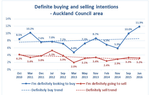In Auckland there is an estimated undersupply of 41,200 dwellings – a 30% increase on September 2015’s 31,700 dwelling shortfall.  This has resulted from an increase in definite buying intention from 10% in September 2015 to 11.9% in July 2016, with no increase in definite selling intention.  These results indicate that unless there is a major correction that results in large numbers of dwellings being released on to the market, there is unlikely to be a reduction in Auckland property prices in the near term.