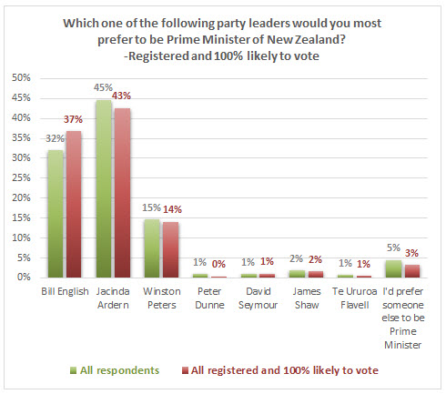 Among the 860 adult respondents who are both registered to vote and 100% likely to vote, Ardern leads English by 43% to 37%.