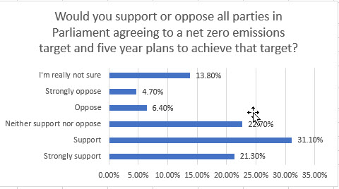 52.5% of business managers and executives and 68% of business proprietors and self-employed support all parties agreeing to a net zero emissions target and five yearly plans to achieve it.