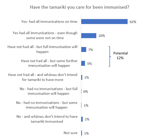 • 12% of carers with tamariki say they haven’t had all their immunisations but will get round to either full or further immunisations.