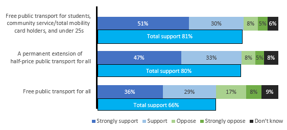 The finding that four in five adults support a permanent extension of half-price public transport for everyone, compares with a recent 1,000- respondent 1News Kantar Public Poll which found 79% support and 14% oppose.