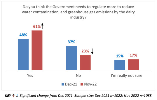 The poll also shows increasing support for the Government to introduce laws to lower the number of dairy cows. In December 2021, 51% opposed passing laws to lower the number of dairy cows in the country. This has dropped to 44%, and in November 2022, 33% support the idea (significantly up from 25% a year ago).