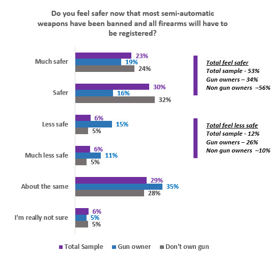 Respondents were asked whether they felt safer or less safe now most semi-automatic weapons have been banned and all firearms will have to be registered.