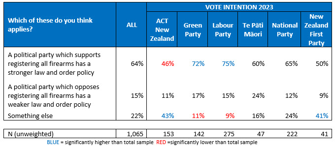Among intending voters 72% of Green and 75% of Labour voters feel a political party has a stronger law and order policy if it supports a firearms register.