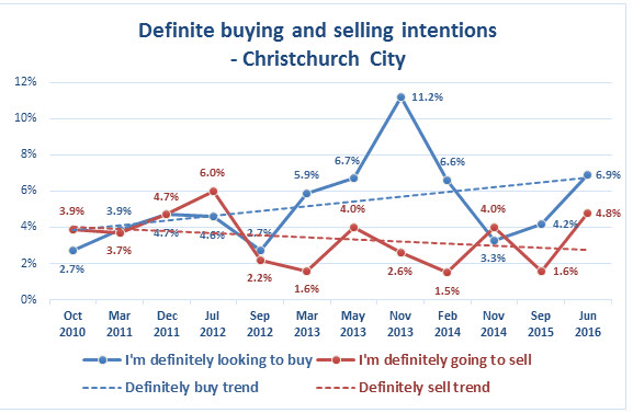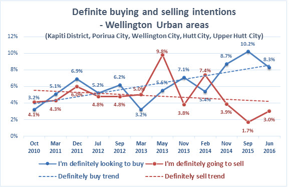 In Auckland there is an estimated undersupply of 41,200 dwellings – a 30% increase on September 2015’s 31,700 dwelling shortfall.  This has resulted from an increase in definite buying intention from 10% in September 2015 to 11.9% in July 2016, with no increase in definite selling intention.  These results indicate that unless there is a major correction that results in large numbers of dwellings being released on to the market, there is unlikely to be a reduction in Auckland property prices in the near term.