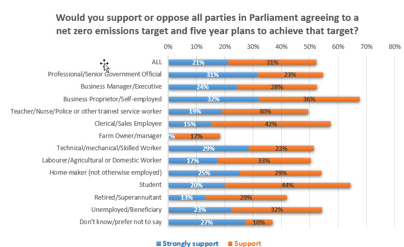 52.5% of business managers and executives and 68% of business proprietors and self-employed support all parties agreeing to a net zero emissions target and five yearly plans to achieve it.