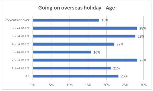 By age, 28% of each of the 25-34, 55-64 and 65-74 year-old age groups intend to holiday overseas.