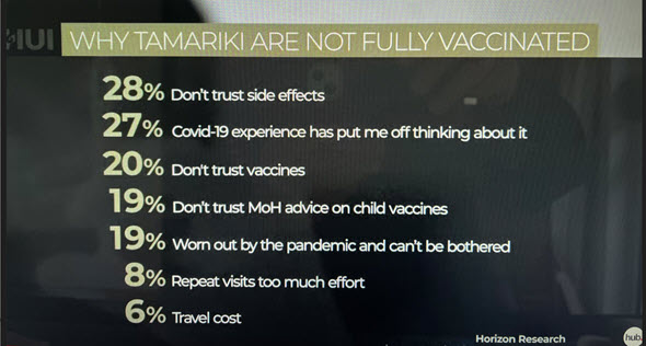 • When asked why tamariki were not fully immunised, 28% were worried about side effects. The Covid-19 pandemic has also had an effect with 27% saying it has put them off thinking about vaccines and 19% are worn out by it and can’t be bothered.