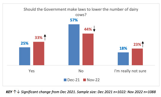The poll also shows increasing support for the Government to introduce laws to lower the number of dairy cows. In December 2021, 51% opposed passing laws to lower the number of dairy cows in the country. This has dropped to 44%, and in November 2022, 33% support the idea (significantly up from 25% a year ago).