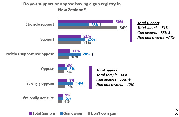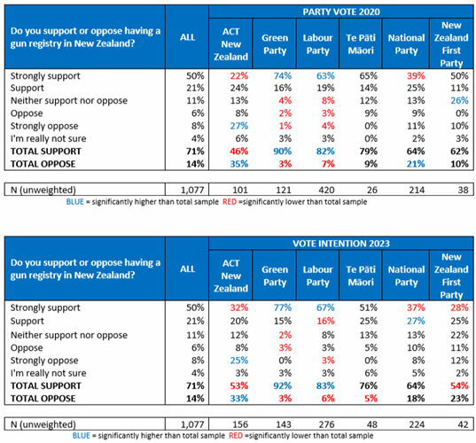 71% of adults in New Zealand support the gun registry with only 14% opposed. There is majority support from voters for all main parties, including 53% of those intending to vote for ACT (which wants to repeal and replace current policy).