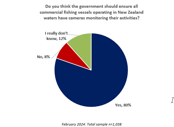 There is strong support for commercial fishing vessels operating in New Zealand to be monitored. 80% (3,251,000 adults) say cameras should be on all commercial vessels operating in New Zealand waters to monitor activities.